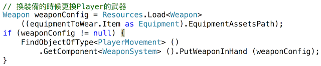 最後是換裝的程式碼,我用Resources.Load方法讀取放置在Resources資料夾內的武器設定(Weapon.cs),然後使用WeaponSystem.PutWeaponInHand方法更換武器。