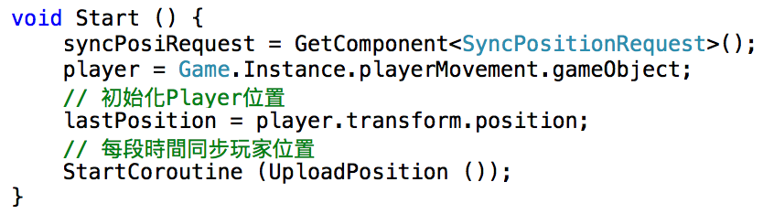 Request物件建立好以後,我們還需要一個物件來管理所有『同步位置』的相關功能。所以,請大家再新增一個Script,名為SyncPosition。於SyncPosition中使用GetComponent取得SyncPositionRequest,然後紀錄Player的初始位置。接著用StartCoroutine呼叫同步功能。